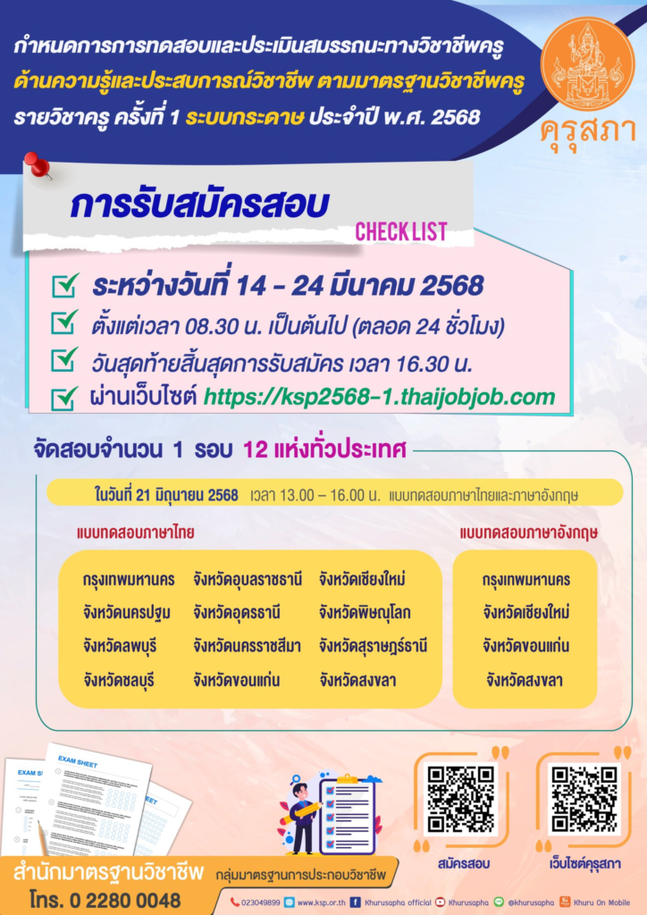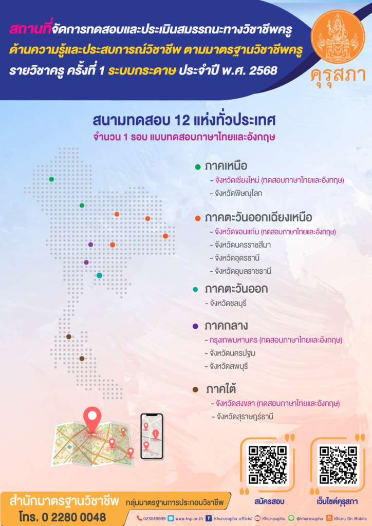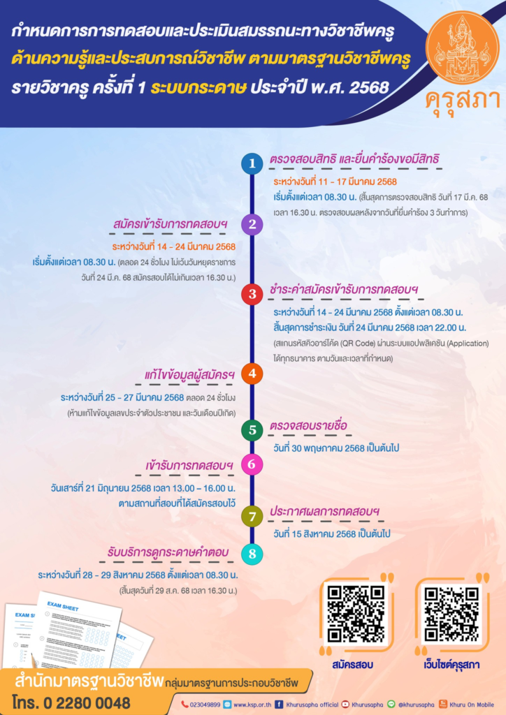 “คุรุสภาเปิดรับสมัครการเข้ารับการทดสอบและประเมินสมรรถนะทางวิชาชีพครู ด้านความรู้และประสบการณ์วิชาชีพ ตามมาตรฐานวิชาชีพครู รายวิชาครู ครั้งที่ 1 ระบบกระดาษ ประจำปี พ.ศ. 2568″